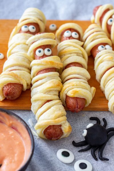 While most of these recipes are sweet, I definitely recommend starting with a savoury snack and sausage rolls are usually my go to. That’s why I had to show you these cute puff pastry hot dog mummies from Appetizer Addiction. I would definitely use mini chipolatas instead of hot dogs, but these are so fun.